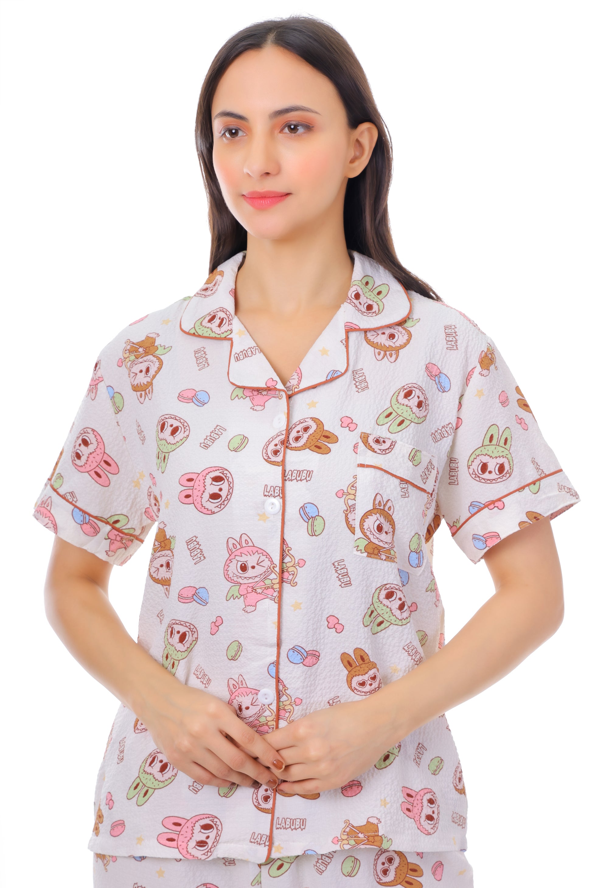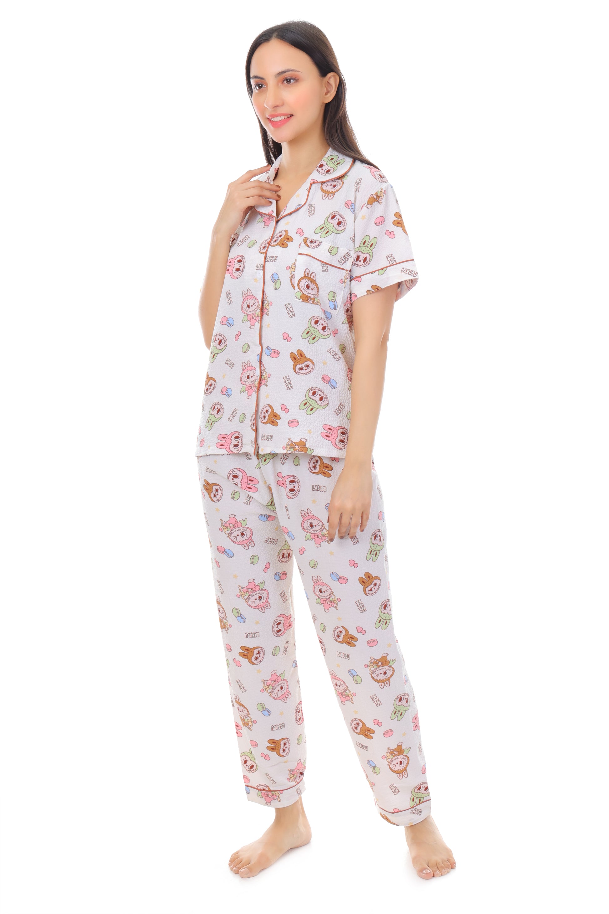 Indulge in ultimate comfort and style with our charming Cartoon pajama set. This delightful two-piece ensemble features a soft, breathable crepe fabric that feels incredibly gentle against your skin, perfect for those relaxing nights in. The white base is playfully adorned with a sweet repeating pattern of cartoon bears. The classic collared short-sleeved top boasts a relaxed fit, ensuring unrestricted movement for a truly restful sleep. The matching pants feature an equally comfortable and relaxed fit with a comfortable elastic waistband. These pajamas aren't just for bedtime; their stylish design makes them perfect for lounging around the house, enjoying a cozy movie night, or even a quick trip to the grocery store.